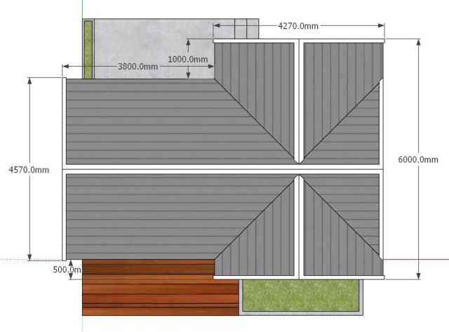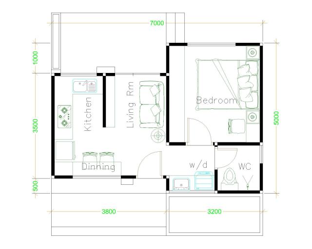 Overall, this one-bedroom house comes with: One bedroom, one bathroom, a kitchen, a living room, a dining hall, and a washing area in a 5 by 7 square meters living space.