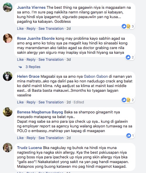 Some domestic helpers who suffered from the same disease told her that she is suffering from psoriasis. This skin disease is normal in dry and hot countries and may result in small scratches to big wounds. They also shared that in Kuwait, the medications for this skin disease is free.