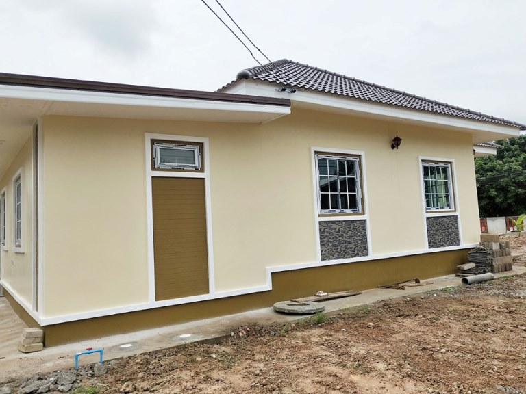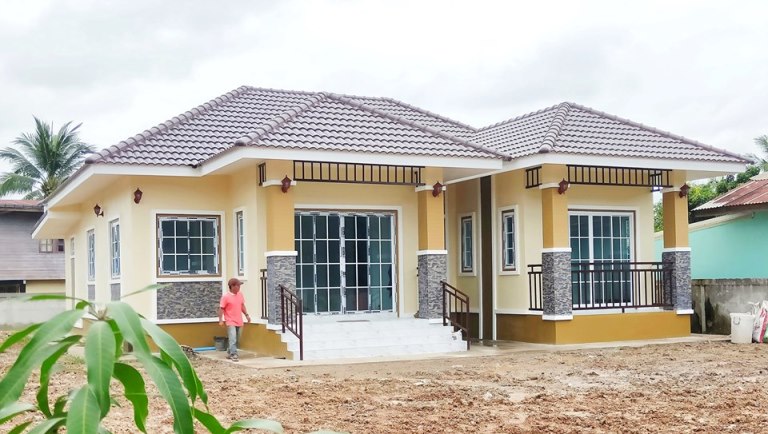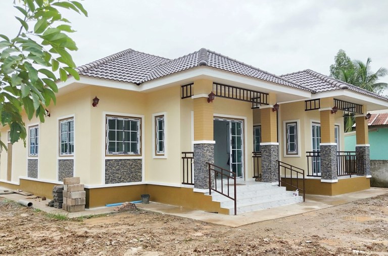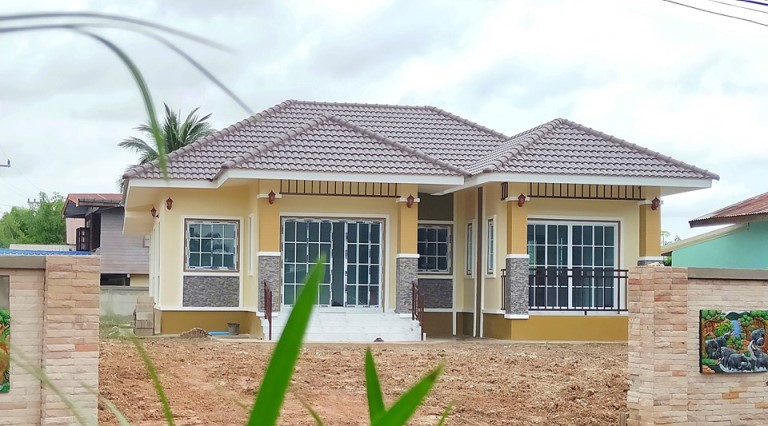The overall design of this bungalow is square shape, with a canopy roof that gives a modern feel to the whole house. There are high clear glass windows which helps the natural air and lighting inside the house. It keeps the house bright throughout the day, giving the whole home a comfortable and homey feel to it.